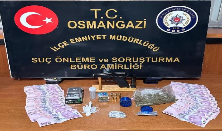 Osmangazi İlçe Emniyet Müdürlüğü Suç Önleme ve Soruşturma (SÖS) Büro Amirliği ekipleri, uyuşturucu madde ticaretine yönelik ihbar üzerine Çekirge Mahallesi'ndeki adrese operasyon düzenledi. Polis ekiplerini görünce kaçan İbrahim Ç., takip sonucu yakalanırken, üst aramasında ve sırt çantasında yapılan aramada, 175 gram bonzai, 12 gram metamfetamin, 1 hassas terazi, uyuşturucu satışından elde edilen 6 bin 400 TL, 1 ruhsatsız tabanca ve 10 dolu fişek ele geçirildi. İbrahim Ç., uyuşturucuların Hasan Y.'ye ait olduğunu iddia etti. Bunun üzerine Hasan Y. de gözaltına alındı. 2 şüphelinin emniyetteki işlemlerinin sürdüğü bildirildi. (DHA)