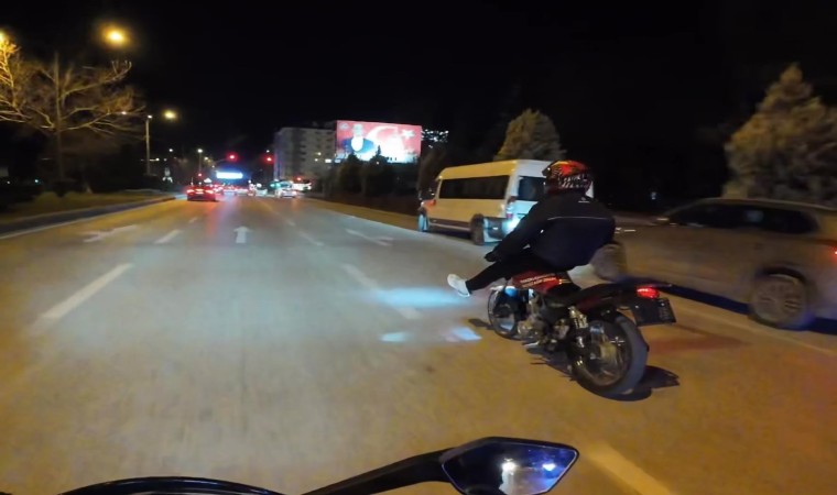 Eskişehir’de geçtiğimiz günlerde gece saatlerinde Atatürk Bulvarı’nda 3 motosikletli gezintiye çıktı. Gruptan biri motosikletini ön tekerini kaldırarak caddede uzun süre tek teker üzerinde ilerleyip zaman zaman makas atarak trafiği tehlikeye soktu. Yaptığı tehlikeli hareketlerden sonra grup, kırmızı ışıkta durdu. O sırada gruba vatandaş gibi yanaşan sivil polis, hiçbir şey söylemeden 3 motosikletin motorunu durdurup anahtarları topladı. Polisin sivil vatandaş olduğunu düşünen motosikletli grup belli bir süre şaştı kaldı. Yaşananlar, grupta motosiklet kullanan Salih Kızıl’ın kask kamerasına saniye saniye yansıdı.