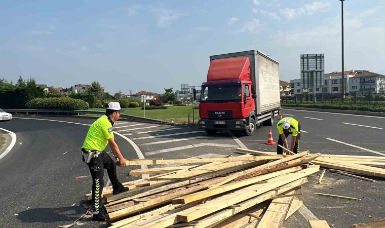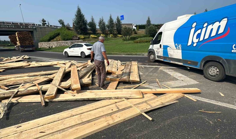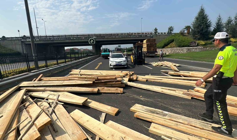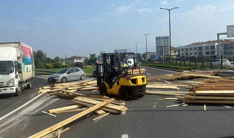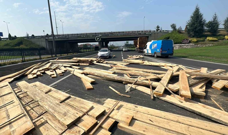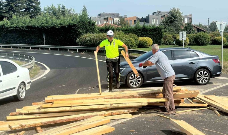 Düzce’de Kervan Kavşağında virajı giren tırın dorsesinde yüklü olan keresteler yola saçıldı. Polis ekipleri vatandaşlarla birlikte keresteleri kaldırarak yolu açtı.
