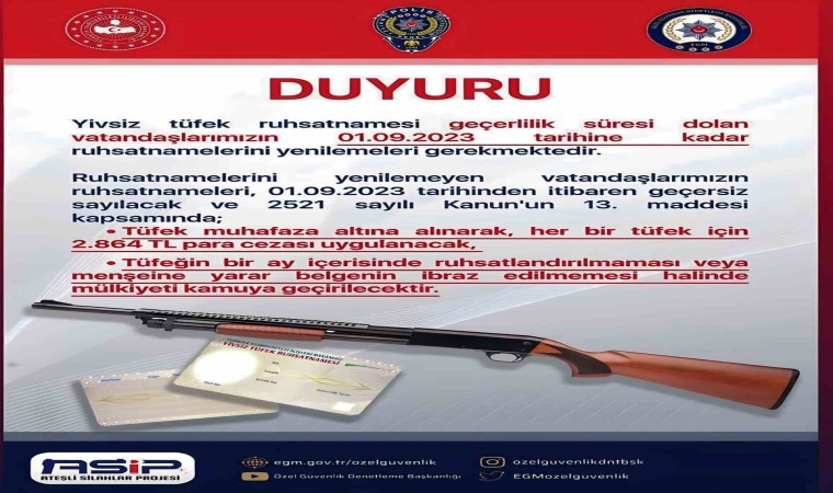 Yapılan açıklamada, “Yivsiz tüfek ruhsatnamesi geçerlilik süresi dolan vatandaşlarımızın 01.09.2023 tarihine kadar ruhsatnamelerini yeniletmeleri gerekmekte olup yeniletmeyen kişilerin ruhsatnameleri 01.09.2023 tarihinden sonra geçersiz sayılacak ve ilgililer hakkında 2521 sayılı Kanun’un 13. maddesi kapsamında işlem uygulanacaktır.” denildi.
