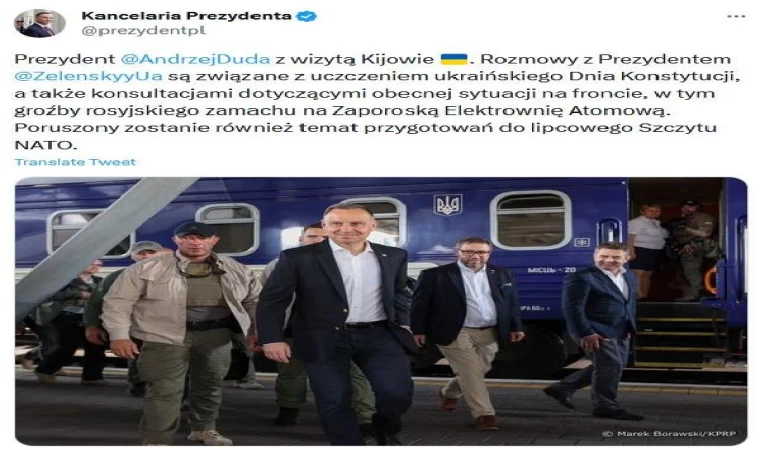 Polonya Cumhurbaşkanı Andrzej Duda'nın Kiev'i ziyaret etmesi hakkındaki resmi açıklamada, "Cumhurbaşkanı Andrzej Duda Ukrayna'nın başkenti Kiev'i ziyaret ediyor. Bu ziyaret sırasında Ukrayna Anayasa Günü'nün yanı sıra Zaporijya Nükleer Santrali'ne yönelik Rus saldırısı tehdidi gibi cephedeki mevcut durum da ele alınacak. Ayrıca, Temmuz ayında yapılacak olan NATO Zirvesi için yapılacak hazırlıklar da görüşülecek" ifadeleri kullanıldı.