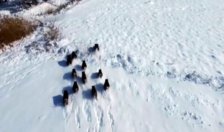 Erzincan’da popülasyonu artan ve yaz aylarında çiftçilerin mahsullerine zarar verdiği için dert yakındıkları domuz sürüsü karla kaplı arazide havadan dron kamera ile görüntülendi.