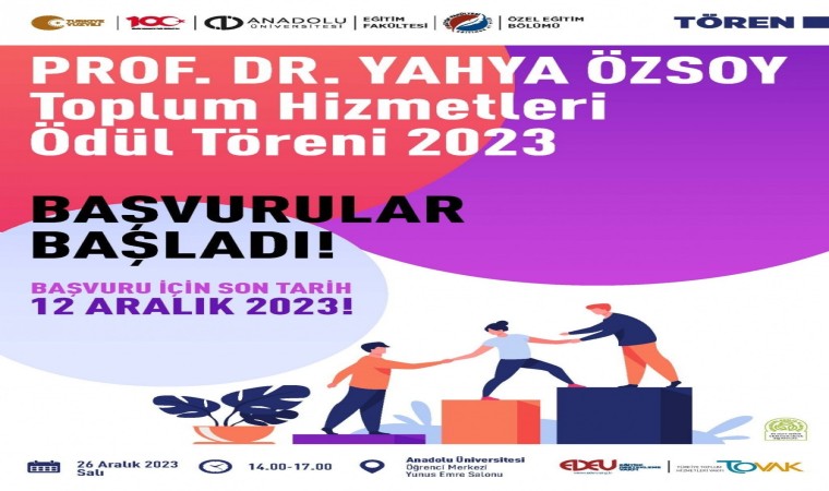 Bu yıl Anadolu Üniversitesi Eğitimi Destekleme Vakfı (EDEV) ile TOVAK iş birliğinde 26 Aralık Salı günü Anadolu Üniversitesi Öğrenci Merkezi Yunus Emre Salonu’nda düzenlenecek “Prof. Dr. Yahya Özsoy Toplum Hizmetleri Ödülü” başvuruları için son tarih 12 Aralık 2023 olarak belirlendi.