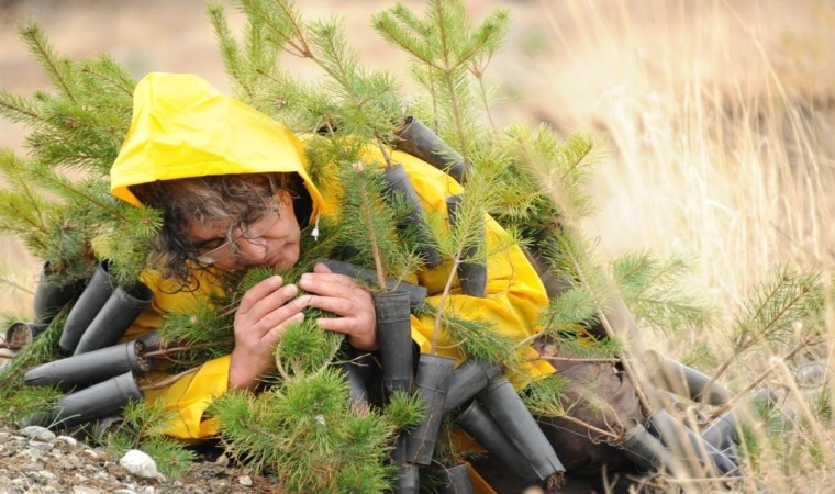 Erzincan’da sarı renkli yağmurluk üzerine vücudunun tamamına çam fidanlarını asıp cadde ve sokakları yürüyen profesörün halini görenler gözlerine inanamadı.