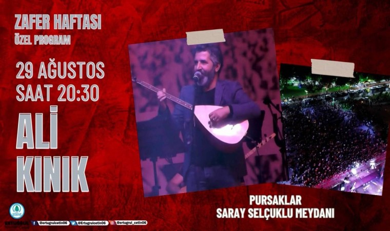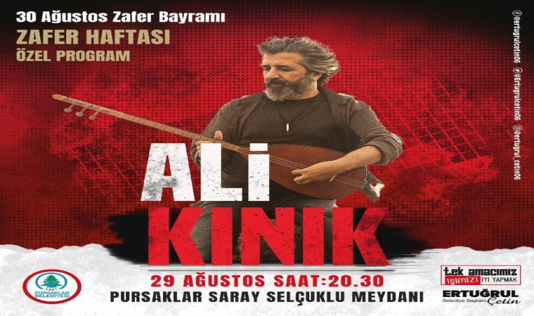 Ankara’nın Pursaklar Belediyesi, Selçuklu Meydanında 30 Ağustos Zafer Bayramını sanatçı Ali Kınık’ın katılımlarıyla kutlayacak