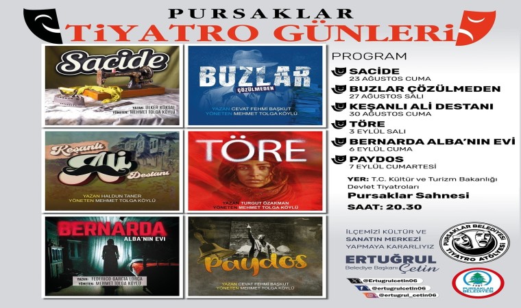 Pursaklar Tiyatro Günleri, ‘‘Sacide’’ oyunu ile 23 Ağustos Cuma saat 20.30’da Devlet Tiyatroları Pursaklar Sahnesinde başlarken, 6 farklı günde 6 farklı oyun sanatseverlerle buluşacak. Pursaklar Belediyesi, tüm etkinliklerin ücretsiz olduğunu açıklarken, tiyatro biletlerinin Pursaklar Yaşam Merkezi, Devlet Tiyatroları Pursaklar Sahnesi ve Pursaklar Belediye Binası Kültür İşleri Müdürlüğü’nde temin edilebileceğini belirtti.