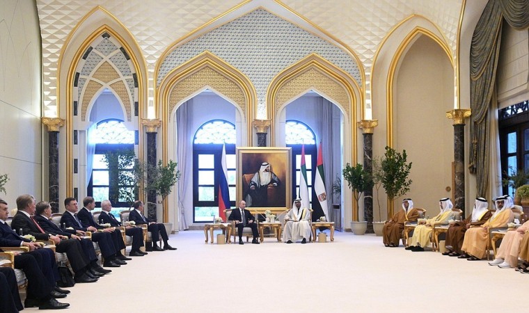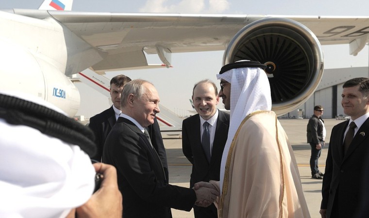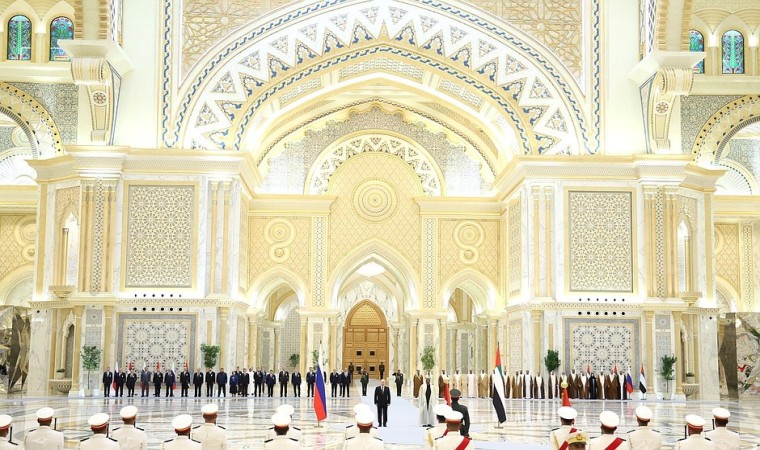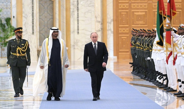 Rusya Devlet Başkanı Vladimir Putin, Orta Doğru ziyareti kapsamında BAE’nin başkenti Abu Dabi’ye geldi. Yoğun güvenlik önlemleri altında Moskova’dan kalkan uçakla Abu Dabi’ye gelen Putin’e Rus Hava Kuvvetleri’ne ait 4 adet Su-35 savaş uçağı eşlik etti. Havaalanından Qasr Al Watan Başkanlık Sarayı’na geçen Putin askeri törenle karşılanırken, gösteri uçakları da Rusya bayrağının rengini püskürterek uçuş gerçekleştirdi. Putin, daha sonra BAE Devlet Başkanı Şeyh Muhammed bin Zayed Al Nahyan tarafından kapıda karşılandı. İki lider, görüşmede ikili ilişkilere ve bölgesel konulara dair açıklamalarda bulundu.