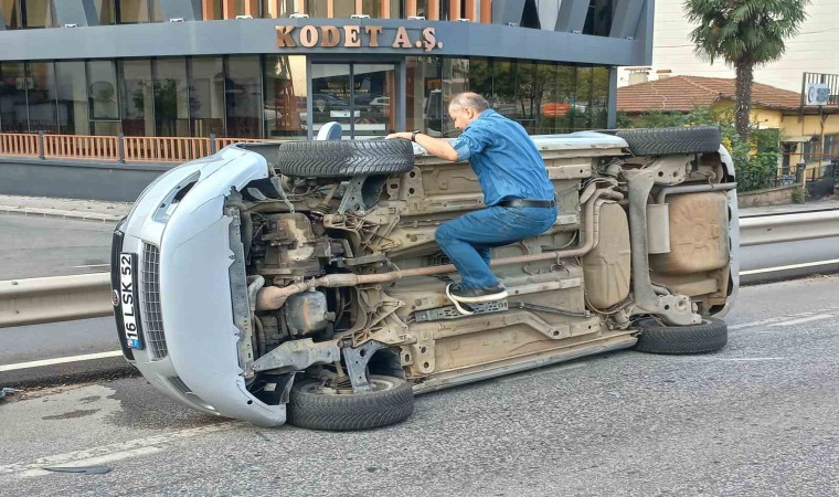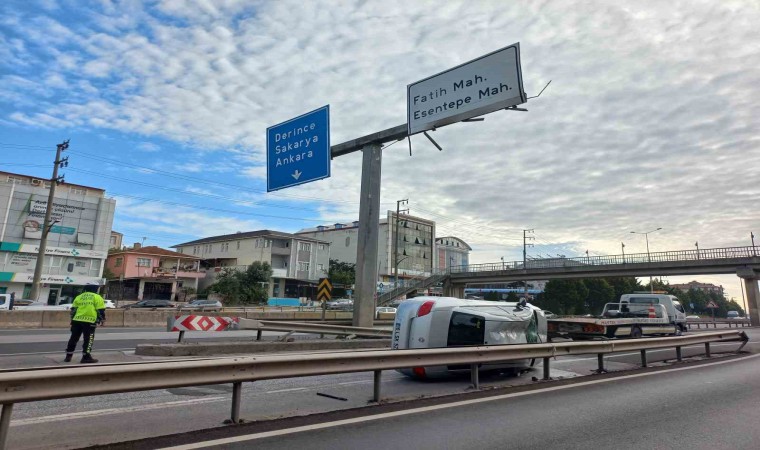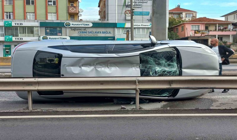 Kocaeli’nin Körfez ilçesinde refüje çarpıp yan yatan otomobilin, yan yola yuvarlanmasını bariyer engelledi. Sürücü kazayı yara almadan atlattı.