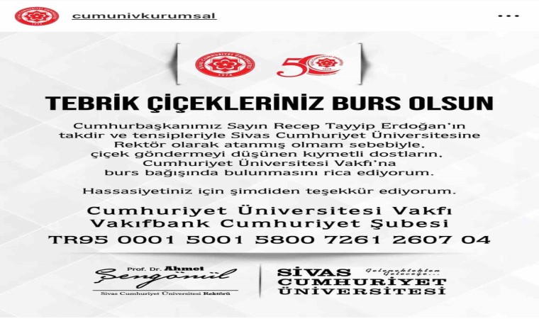 Sivas Cumhuriyet Üniversitesi rektörlüğüne atanan Prof. Dr. Ahmet Şengönül, çiçek ve çelenk tebrikleri yerine burs bağışı yapılması ricasında bulundu.