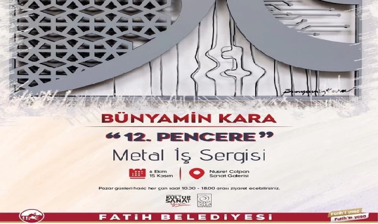 İSTANBUL, (DHA)- Fatih Belediyesi Nusret Çolpan Sanat Galerisi ressam Bünyamin Kara’nın ‘12 Pencere’ isimli metal iş sergisine ev sahipliği yapıyor. Bugün açılışı yapılacak sergide, sanatçının 14 metal işinden oluşan eserleri bulunuyor. Sergi, 5 Kasım’a kadar ziyaret edilebilir.