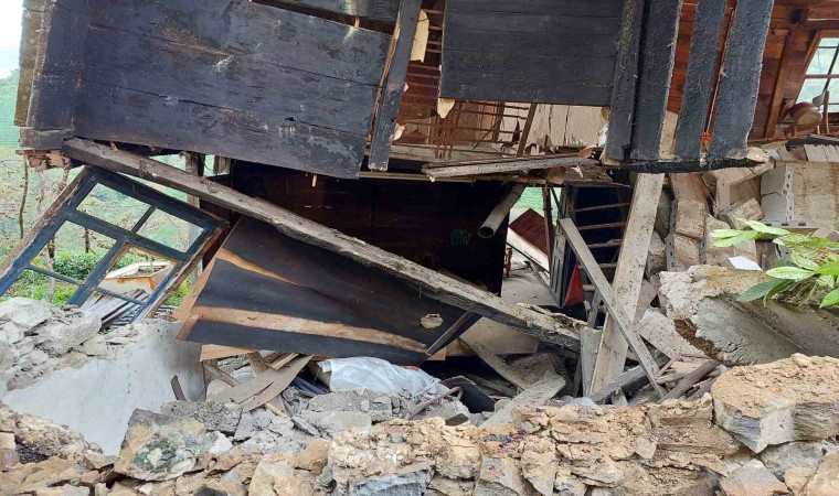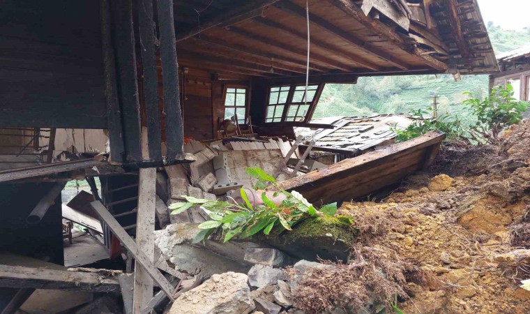 Rize’de şiddetli sağanak yağışların hayatı olumsuz etkilediği asırlık ahşap ev heyelan nedeniyle yıkıldı.