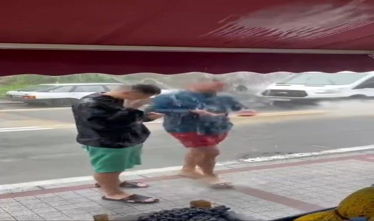 Rize merkezde sıcaktan bunalan gençler, yağmuru fırsat bilerek yağmur altında duş aldı.