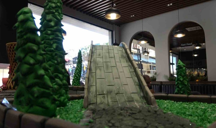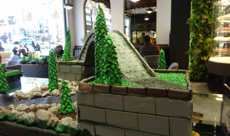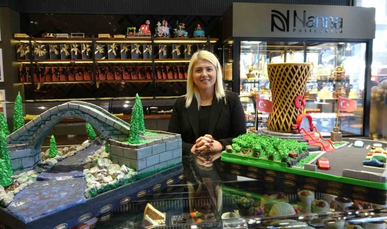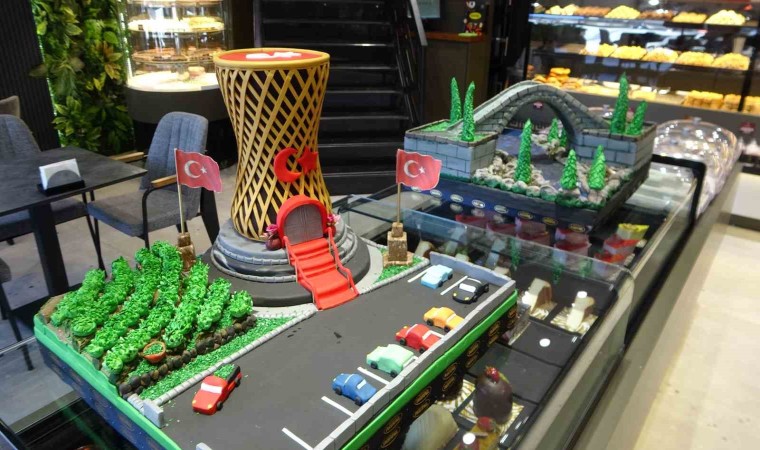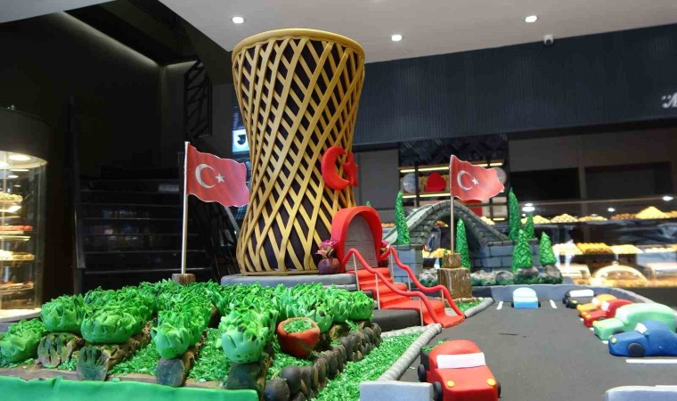 Rize’nin simge yapıları arasında yer alan şehir merkezindeki 29 metrelik dev çay bardağı ve yörenin tarihi kemer köprüleri bir pastane işletmesi tarafından pastaya dönüştürüldü.