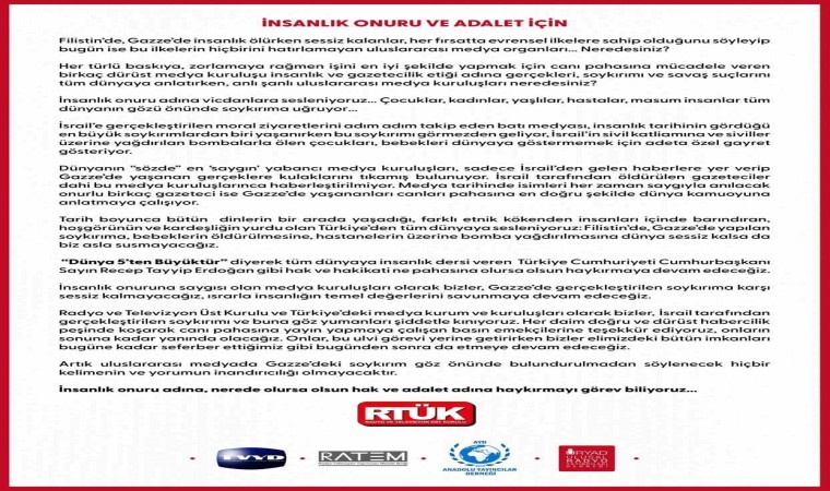 Sosyal medya üzerinden yaptığı paylaşımda Filistin için birlik ve beraberlik içerisinde olunması gerektiğini hatırlatan Ebubekir Şahin, “Filistin’de, Gazze’de insanlık ölürken sessiz kalanlar, her fırsatta evrensel ilkelere sahip olduğunu söyleyip bugün ise bu ilkelerin hiçbirini hatırlamayan uluslararası medya organları, neredesiniz? Her türlü baskıya, zorlamaya rağmen işini en iyi şekilde yapmak için canı pahasına mücadele veren birkaç dürüst medya kuruluşu insanlık ve gazetecilik etiği adına gerçekleri, soykırımı ve savaş suçlarını tüm dünyaya anlatırken, anlı şanlı uluslararası medya kuruluşları neredesiniz? İnsanlık onuru adına vicdanlara sesleniyoruz. Çocuklar, kadınlar, yaşlılar, hastalar, masum insanlar tüm dünyanın gözü önünde soykırıma uğruyor. İsrail’e gerçekleştirilen moral ziyaretlerini adım adım takip eden Batı medyası, insanlık tarihinin gördüğü en büyük soykırımlardan biri yaşanırken bu soykırımı görmezden geliyor, İsrail’in sivil katliamına ve siviller üzerine yağdırılan bombalarla ölen çocukları, bebekleri dünyaya göstermemek için adeta özel gayret gösteriyor. Dünyanın ’sözde’ en ’saygın’ yabancı medya kuruluşları, sadece İsrail’den gelen haberlere yer verip Gazze’de yaşanan gerçeklere kulaklarını tıkamış bulunuyor. İsrail tarafından öldürülen gazeteciler dahi bu medya kuruluşlarınca haberleştirilmiyor. Medya tarihinde isimleri her zaman saygıyla anılacak onurlu birkaç gazeteci ise Gazze’de yaşananları canları pahasına en doğru şekilde dünya kamuoyuna anlatmaya çalışıyor. Tarih boyunca bütün dinlerin bir arada yaşadığı, farklı etnik kökenden insanları içinde barındıran, hoşgörünün ve kardeşliğin yurdu olan Türkiye’den tüm dünyaya sesleniyoruz: Filistin’de, Gazze’de yapılan soykırıma, bebeklerin öldürülmesine, hastanelerin üzerine bomba yağdırılmasına dünya sessiz kalsa da biz asla susmayacağız. ’Dünya 5’ten Büyüktür’ diyerek tüm dünyaya insanlık dersi veren Türkiye Cumhuriyeti Cumhurbaşkanı Sayın Recep Tayyip Erdoğan gibi hak ve hakikati ne pahasına olursa olsun haykırmaya devam edeceğiz. İnsanlık onuruna saygısı olan medya kuruluşları olarak bizler, Gazze’de gerçekleştirilen soykırıma karşı sessiz kalmayacağız, ısrarla insanlığın temel değerlerini savunmaya devam edeceğiz. Radyo ve Televizyon Üst Kurulu ve Türkiye’deki medya kurum ve kuruluşları olarak bizler, İsrail tarafından gerçekleştirilen soykırımı ve buna göz yumanları şiddetle kınıyoruz. Her daim doğru ve dürüst habercilik peşinde koşarak canı pahasına yayın yapmaya çalışan basın emekçilerine teşekkür ediyoruz, onların sonuna kadar yanında olacağız. Onlar, bu ulvi görevi yerine getirirken bizler elimizdeki bütün imkanları bugüne kadar seferber ettiğimiz gibi bugünden sonra da etmeye devam edeceğiz. Artık uluslararası medyada Gazze’deki soykırım göz önünde bulundurulmadan söylenecek hiçbir kelimenin ve yorumun inandırıcılığı olmayacaktır. İnsanlık onuru adına, nerede olursa olsun hak ve adalet adına haykırmayı görev biliyoruz” ifadelerini kullandı.