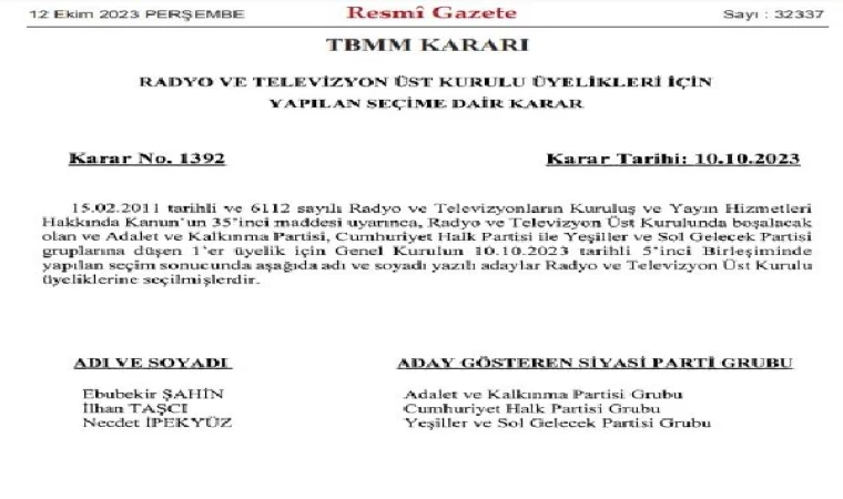 Barış TAŞKIRAN/ ANKARA, (DHA)- RADYO ve Televizyon Üst Kurulu (RTÜK) Üyelikleri İçin Yapılan Seçime Dair Türkiye Büyük Millet Meclisi (TBMM) Kararı, Resmi Gazete'de yayımlandı.