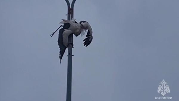 Rusya’da elektrik direğinde asılı kalan leylek, böyle kurtarıldı