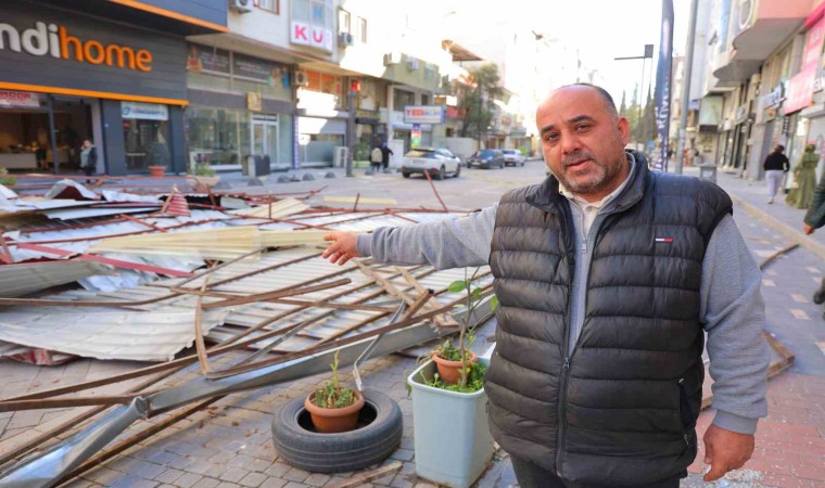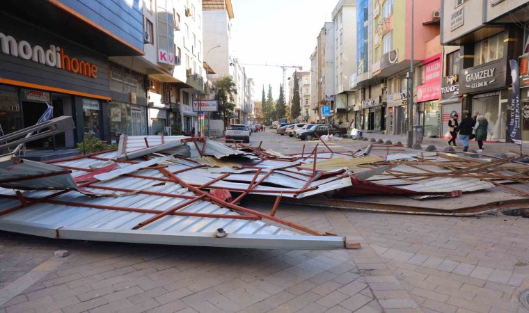 Kahramanmaraş’ta kuvvetli rüzgarda uçan çatı yolda yürüyen bir kişinin üzerine düştü. O anlar anbean görüntülendi.