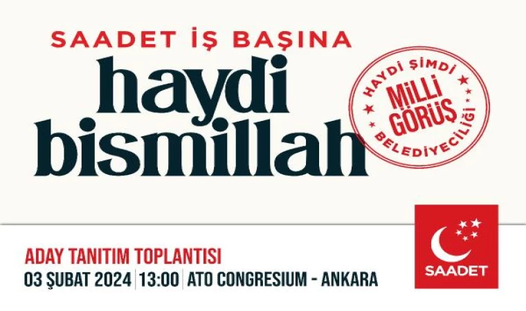 "Milli Görüş Belediyeciliği anlayışını temsil eden Saadet Partisi, yaklaşan yerel seçimlerde seçmene 'Saadet İş Başına Haydi Bismillah' diyerek seslenecek. 3 Şubat Cumartesi Günü, saat 13.00'te, Ankara ATO Congresium'da gerçekleştireceği aday tanıtım toplantısıyla Saadet Partisi; Milli Görüş belediyeciliği anlayışını tanıtacak ve belediye başkan adaylarını açıklayacak."