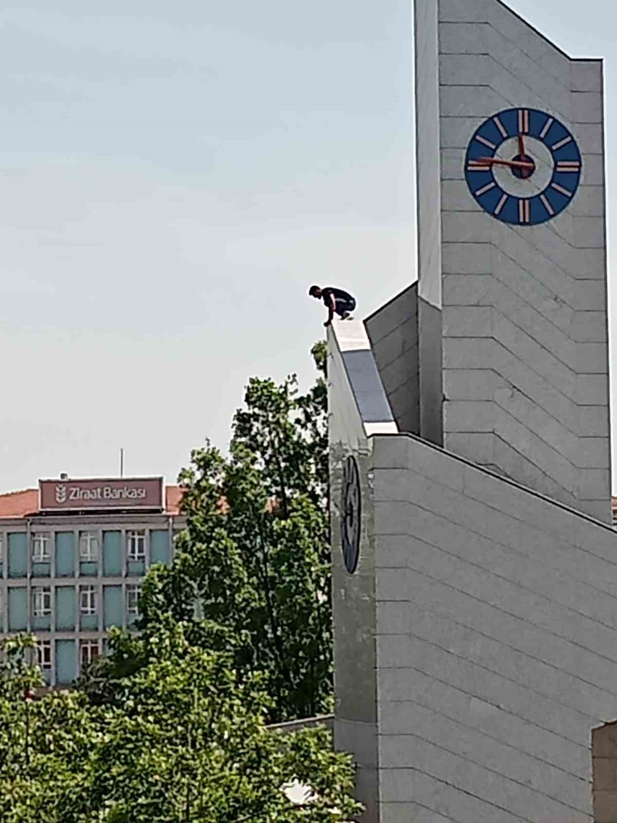SAAT KULESİNE TIRMANAN GENCİN TEHLİKELİ OYUNU KAMERAYA YANSIDI