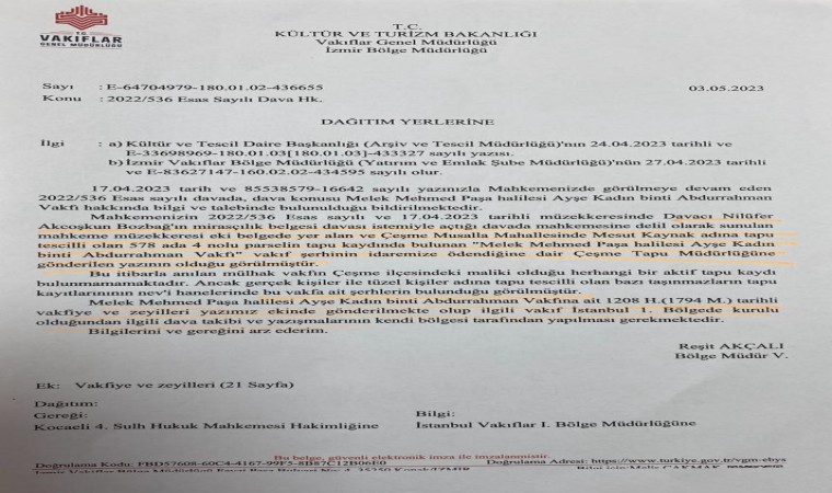 Önce Melek Mehmed Paşa’nın kızının ismini taşıyan vakıftan hak talep edebilmek için dava açtığını belirten Nilüfer Akcoşkun Bozbağ, "Melek Mehmed Paşa Celilesi Ayşe Hanım Vakfı’nı önce alalım, sonra babasına geçiş yapalım dedik. Aşağıdan yavaş yavaş geldik. Vakıflar Müdürlüğü Melek Mehmed Paşa’nın kızı ile ilgili belgeyi bize vermek istemiyor. Çünkü Çeşme’de çok büyük arazileri var ama Vakıflar’a ait. Sonuçta ben o vakıfları satacak değilim, işleteceğiz. Vakıfların sahibiyiz, bizlere verilmesini talep ediyorum. Melek Mehmed Paşa’nın davasını henüz açmadım çünkü kızı ile ilgili açılan davada tıkanma yaşadım" şeklinde konuştu.