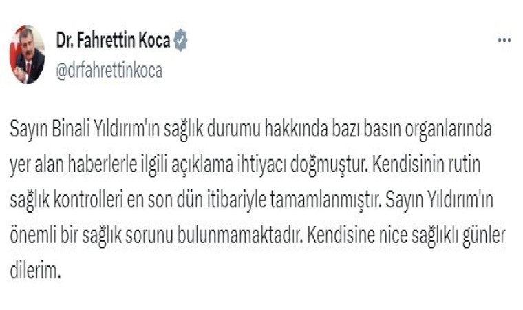 Sağlık Bakanı Fahrettin Koca, AK Parti Genel Başkanvekili Binali Yıldırım'ın sağlık durumu hakkında basın organlarında yer alan haberlerin ardından açıklamalarda bulundu. Yıldırım'ın sağlık durumuna ilişkin sosyal medya hesabından paylaşımda bulunan Koca, "Binali Yıldırım'ın sağlık durumu hakkında bazı basın organlarında yer alan haberlerle ilgili açıklama ihtiyacı doğmuştur. Kendisinin rutin sağlık kontrolleri en son dün itibarıyla tamamlanmıştır. Yıldırım'ın önemli bir sağlık sorunu bulunmamaktadır. Kendisine nice sağlıklı günler dilerim" ifadelerini kullandı.