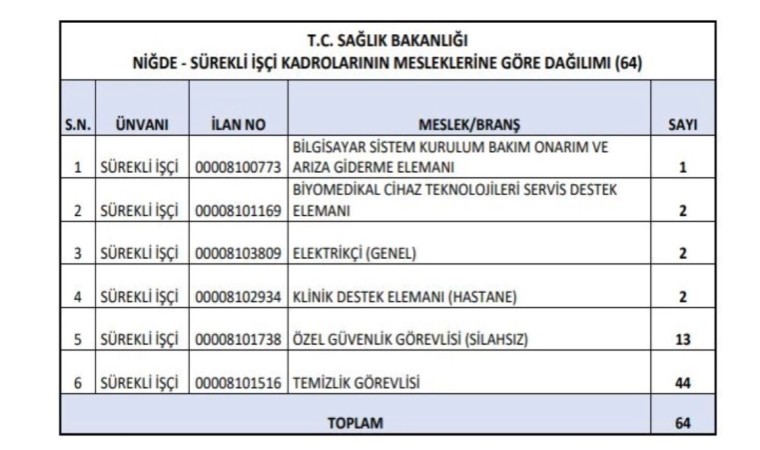 Sağlık Bakanlığı Niğde’de 44 tanesi temizlik personeli olmak üzere toplamda 64 sürekli işçi alımı yapacak, başvurular yarın sona erecek.
