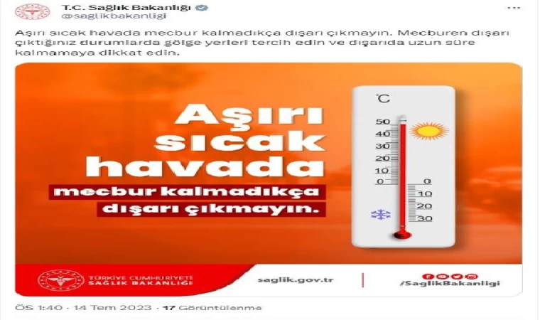 ANKARA, (DHA)- SAĞLIK Bakanlığı tarafından, ’Aşırı sıcak havada mecbur kalmadıkça dışarı çıkmayın’ uyarısı yapıldı.