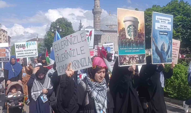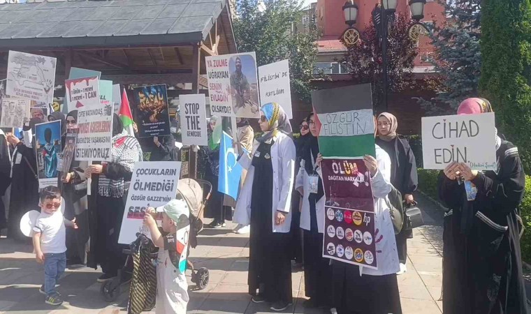 Lala Paşa Camii önünde buluşan sağlık çalışanları Türk ve Filistin bayrakları eşliğinde Yakutiye Medresesi’ne kadar yürüdü.