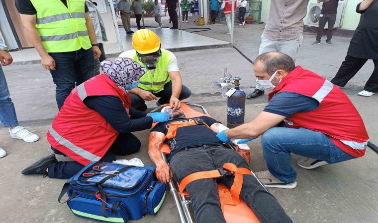 Tatbikat, depremde yaralanan hastaların hastaneye gelişi ile devam etti. Yüzlerine yara makyajı yapılan ve gerçeğiyle birebir benzeyen yaralılar büyük bir özenle tedavi olacakları güvenli alanlara götürüldü. Aynı zamanda deprem sonrası hastanenin kimyasal atık bölümünde çıkan yangınla hastanedeki önlemler kırmızı seviyeye çıkartıldı. İtfaiye ve hastane personelleri yangına müdahale ederken, kimyasal madde bulaşan hastalar da tahliye edildi.