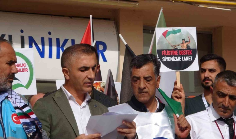 Devlet Hastanesi önünde bir araya gelen sağlıkçılar, ellerinde ’’Soykırıma hayır’’, ’Filistin’e destek, Siyonizme lanet’’ ’yazılı pankartlarla İsrail’e tepki gösterdi.