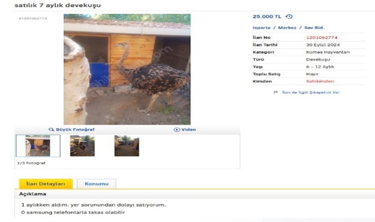 Isparta’da 7 aydır beslediği deve kuşunu internet ortamından 25 bin liraya satışa koyan bir vatandaş ilanın açıklama kısmına ‘sıfır marka cep telefonu ile takas olur’ yazarak ilginç bir alışveriş yöntemine imza attı.
