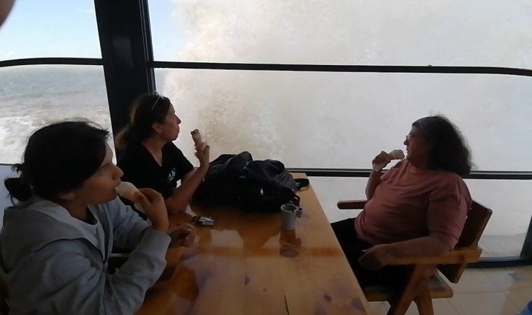 Kafede buluna müşteriler dalgaların kafenin duvarlarını dövmesini dondurma yiyerek izledi. Cam kenarında oturarak dondurma yiyen vatandaşlar, kafenin boyunu aşan dev dalgalara aldırış etmeden dondurmalarını yemeye devam etti.
