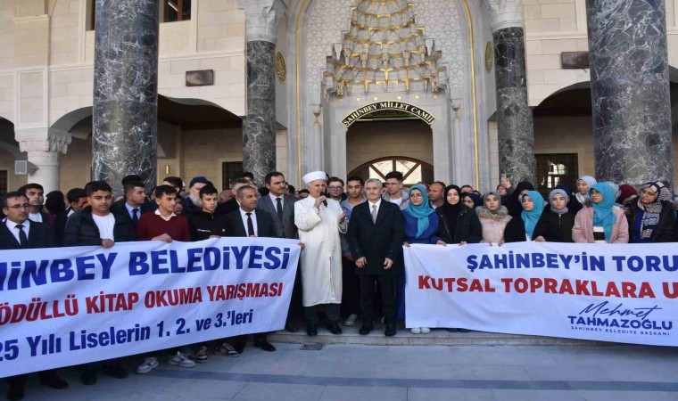 Gaziantep Valiliği, Şahinbey Belediyesi, İl Milli Eğitim Müdürlüğü ve Gaziantep İl Müftülüğü ile birlikte organize edilen proje kapsamında Umre Ödüllü Kitap Okuma Yarışması’nda 1’nci, 2’nci ve 3’ncü olan 177 öğrenci, Şahinbey Belediye Başkanı Mehmet Tahmazoğlu’nun katılımıyla Millet Camii’nde düzenlenen program ile Umre’ye yolcu edildi.