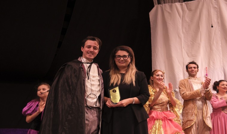Sahne Tozu Tiyatrosu Müdürü Arif Yıldırım, oyun sonunda destek veren şirketin yetkilisine plaket takdim etti.