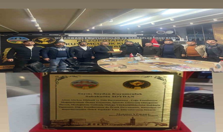 Diyarbakır Kuyumcular ve Sarraflar Odası (DİKO) Başkanı Mehmet Yüksel, sahte altını tespit ederek birçok esnafın mağduriyetini önleyen Diclekent esnafından Sabahattin Soydan’a teşekkür ederek plaket takdim etti.