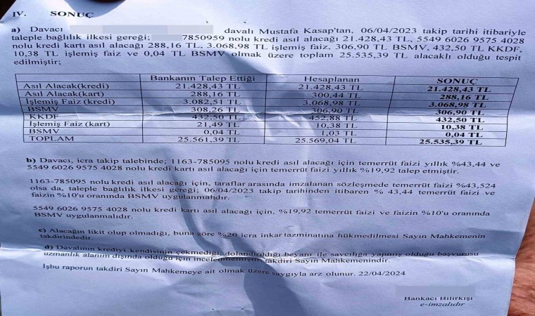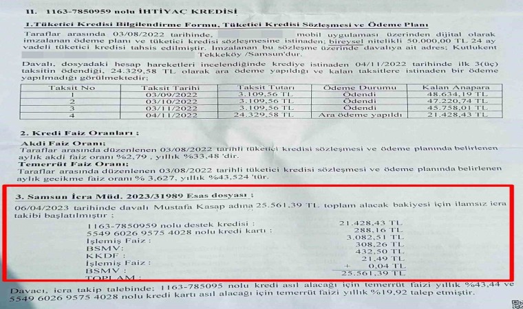 Kimlik bilgilerini verdikten sonra içine kurt düşen Mustafa Kasap, bankaya telefonla ulaşamayınca şubeye giderek durumu öğrenmeye çalıştı. Kredi çekildiğini ve kredi kartı çıkartılıp kullanıldığını öğrenen Kasap, jandarmaya giderek şikayetçi oldu. Samsun 1. Tüketici Mahkemesi tarafından bankaya yaptığı itirazı reddedilen Kasap’a bir de Samsun İcra Müdürlüğü tarafından icra takibi başlatıldı. 45 günlük geri itiraz süresinde karara tekrar itiraz edeceğini ifade eden Kasap, 48 bin TL’lik zararı için yetkililerden yardım istedi.