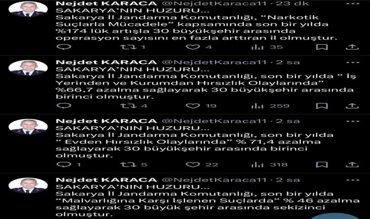 Sakarya İl Jandarma Komutanı Nejdet Karaca, son bir yılda çeşitli suçların azalmasındaki yüzdelikleri ‘Sakarya’nın Huzuru’ başlığıyla sosyal medyada paylaştı. Verilere göre hırsızlık olaylarının büyük oranda azaldığı Sakarya, bu suçun düşüş oranına göre 30 büyükşehir arasında birinci oldu.