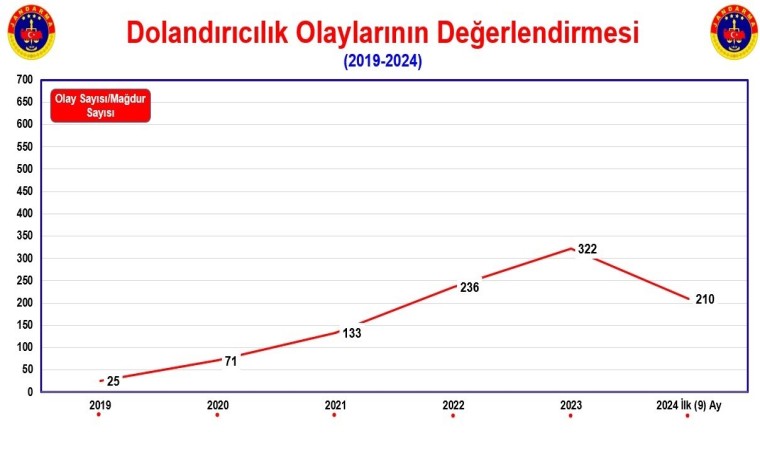 Dolandırıcılık olaylarına karşı yapılan uyarıları önemseyerek okuyan ve dinleyenlerin dolandırılma ihtimallerinin yüzde 80 oranında azaldığı ifade edilen açıklamanın devamında, “2024 yılının ilk dokuz ayında 504 dolandırıcı yakalanarak adalete teslim edilmiştir. Sakarya Jandarma sorumluluk bölgesinde; 2019 yılında 25 dolandırıcılık olayı meydana gelmişken 2020 yılında 71, 2021 yılında 133, 2022 yılında 236 ve 2023 yılında ise 322 olay meydana gelmiştir. Ortalama her yıl bir önceki yılın iki katı olay meydana gelmiş diyebiliriz. Yukarıda sıralanan çabalar ve ortaya koyulan kararlı mücadelenin sonucunda 2024 yılında dolandırıcılık olaylarında nihayet yüzde onluk bir azalma sağlanmıştır. 2023 yılının ilk dokuz ayında 229 dolandırıcılık olayı meydana gelmişken bu yılın ilk dokuz ayında 210 dolandırıcılık olayı meydana gelmiştir. Sakarya İl Jandarma Komutanlığı bir yandan dolandırıcıları yakalamaya öbür yandan da vatandaşlarımızı bilgilendirmeye ve uyarmaya devam edecektir. Yapılan araştırmalara göre; dolandırıcılık olaylarına karşı yapılan uyarıları önemseyerek okuyan veya dinleyenlerin dolandırılma ihtimali yüzde 80 oranında azalıyor. Sorumluluk sahamızdaki her bir vatandaşı bu konularda bilgi sahibi yapmak için çaba göstermeye devam edeceğiz. Sıklıkla hatırlattığımız hususlarda vatandaşlarımızı bir kez daha uyarmak istiyoruz” denildi.