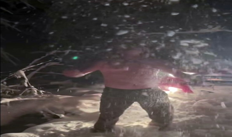 Sakarya’nın Pamukova ilçesinde yüksek kesimlerde etkili olan yağış ile birlikte beyaza bürünen bölgede bir vatandaş, karın keyfini yarı çıplak halde kar banyosu yaparak çıkardı.