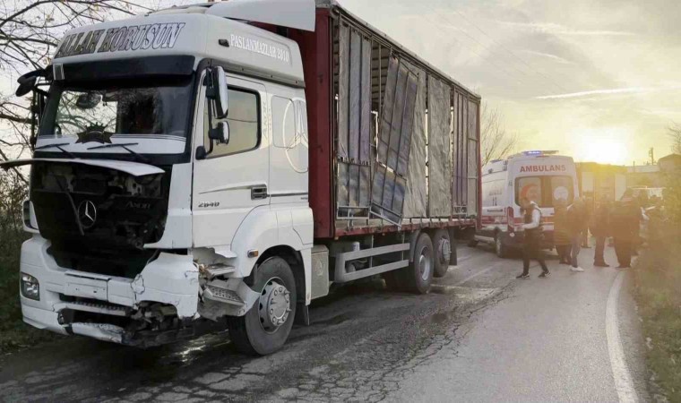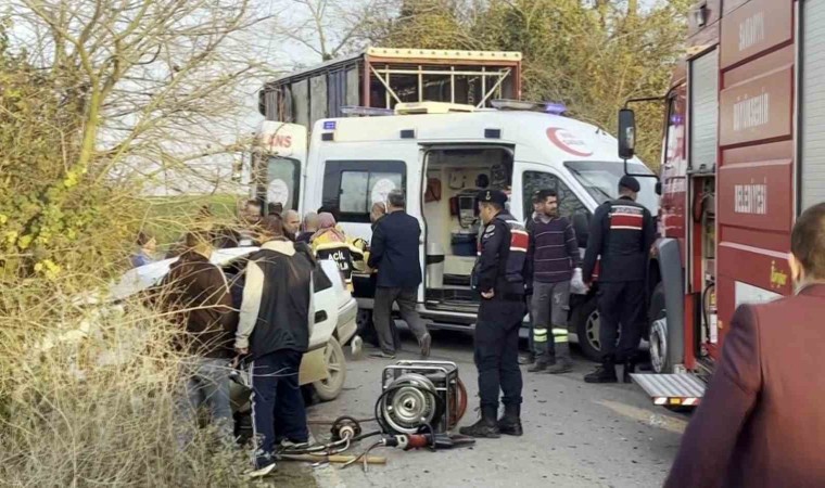 Sakarya’nın Kaynarca ilçesinde kamyon ile çarpışan otomobilin hurdaya döndüğü kazada 2 ağır yaralandı.