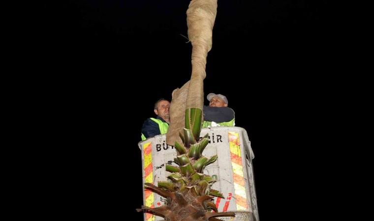 Sakarya Büyükşehir Belediyesi ekipleri, şehrin dokusunu ve güzelliğini koruyacak mevsimlik çalışmalar yapıyor. Yeşilin her tonunu barındıran şehirde kentin merkezini peyzaj dokunuşlarıyla süsleyen Büyükşehir, Yeni Cami bölgesinin simgesi olan palmiye ağaçlarını kış sezonuna hazırladı. 15 Temmuz Caddesi’nde gecenin geç saatlerine kadar çalışma yapan ekipler, yaz mevsimi olan palmiye ağaçlarını en çetin soğuklarda korumak ve varlığını sürdürmek için bazı tedbirler aldı. Üstleri tamamen kapatılan ve soğuktan korunması için hazırlanan palmiyeler kışı bu şekilde geçirecek.