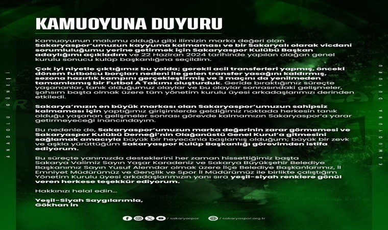 Sakaryaspor’da Amedspor maçı sonrası Yonathan Del Valle ve Cebrail Karayel, takıma veda ederken, Başkanvekili Semih İlkis’in istifa etmesinin ardından bir istifa daha geldi. 22 Haziran gerçekleşen Olağanüstü Kongre’de 45 oy farkla Sakaryaspor Kulüp Başkanlığı’na seçilen Gökhan İn, yaklaşık 2 ay süren başkanlığından bugün istifa ettiğini duyurdu. Yeşil- siyahlı takımın sosyal medya hesabından yapılan açıklamada, "Sakaryaspor’un kayyuma kalmaması ve bir Sakaryalı olarak vicdani sorumluluğumu yerine getirmek için Sakaryaspor Kulüp Başkanlığına adaylığımı açıkladım. 22 Haziran tarihinde yapılan olağan kongrede kulüp başkanlığına seçildim. Çok iyi niyetle çıktığımız bu yolda gerekli acil transferleri yapmış, önceki dönem futbolcu borçlarını sebebi ile gelen transfer yasağını kaldırmış, sezona hazırlık kampını gerçekleştirmiş ve 3 maçı da yenilmeden tamamlamış bir futbol A takımı oluşturduk. Geride bıraktığımız süreçte yaşananlar, tanık olduğumuz olaylar ve bu olaylar sonrasındaki gelişmeler şahsım başta olmak üzere tüm yönetim kurulu üyesi arkadaşlarımı derinden etkiledi. Sakarya’mızın en büyük markası olan Sakaryaspor’umuzun sahipsiz kalmaması için yaptığımız girişimlerde geldiğimiz noktada herkesin tanık olduğu yaşanan gelişmeler sonrası görevde kalmamızın Sakaryaspor’a yarar getirmeyeceği inancındayım. Bu sebeple de Sakaryaspor’umuzun marka değerinin zarar görmemesi ve Sakaryspor Kulüp Derneği’nin Olağanüstü Genel Kurulu’a gitmesini sağlamak gayesiyle büyük bir heyecanla başlamış olduğum büyük bir zevk ve aşkla yürüttüğüm Sakaryaspor Kulüp Başkanlığı görevimden istifa ediyorum" ifadeleri kullanıldı.