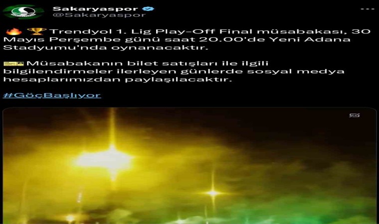 Trendyol 1. Lig’in son haftasında aldığı galibiyet neticesinde direkt olarak play-off finaline çıkan Sakaryaspor, muhtemel rakibiyle Adana’da karşı karşıya gelecek. 30 Mayıs Perşembe günü saat 20.00’de Yeni Adana Stadyumu’nda oynanacak karşılaşmayı Sakaryaspor yönetimi sosyal medayadan duyurdu. Yapılan açıklamada, “Trendyol 1. Lig Play-Off Final müsabakası, 30 Mayıs Perşembe günü saat 20.00’de Yeni Adana Stadyumu’nda oynayacaktır. Müsabakanın bilet satışları ile ilgili bilgilendirmeler ilerleyen günlerde sosyal medya hesaplarımızdan paylaşılacaktır" ifadelerine yer verildi.