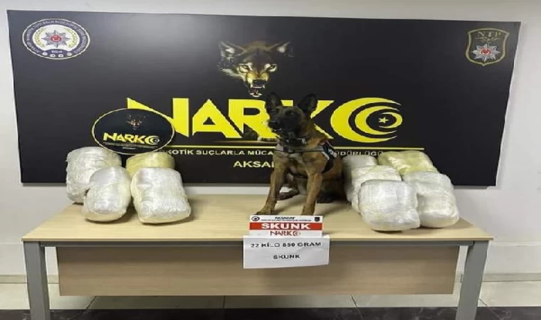 Aksaray Emniyet Müdürlüğü Narkotik Suçlarla Mücadele Şubesi ekipleri, Osmaniye'den İstanbul’a uyuşturucu götürüldüğü ihbarıyla, M.G. yönetimindeki kamyonu, Aksaray-Adana karayolunda durdurdu. Kamyonun kasasında narkotik köpeği Bixi'nin, salatalık kasalarına tepki vermesi üzerine kasalarının altına gizlenmiş 9 paket halinde 22 kilo 850 gram skunk uyuşturucu maddesi ele geçirildi. Kamyon sürücüsü M.G., polis tarafından gözaltına alındı. Emniyetteki işlemleri tamamlanan ve adliyeye sevk edilen sürücü, çıkarıldığı mahkeme tarafından tutuklandı. (DHA)