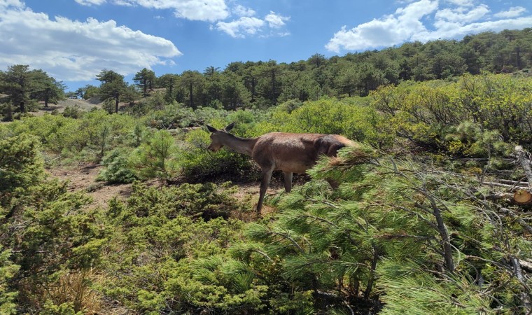 Doğa Koruma ve Milli Parklar ile Tarım ve Orman Bakanlığı’nın düzenlenen projesiyle Salda Gölü çevresine bırakılan 23 kızıl geyikten biri, yavrusu ile görüntülendi.