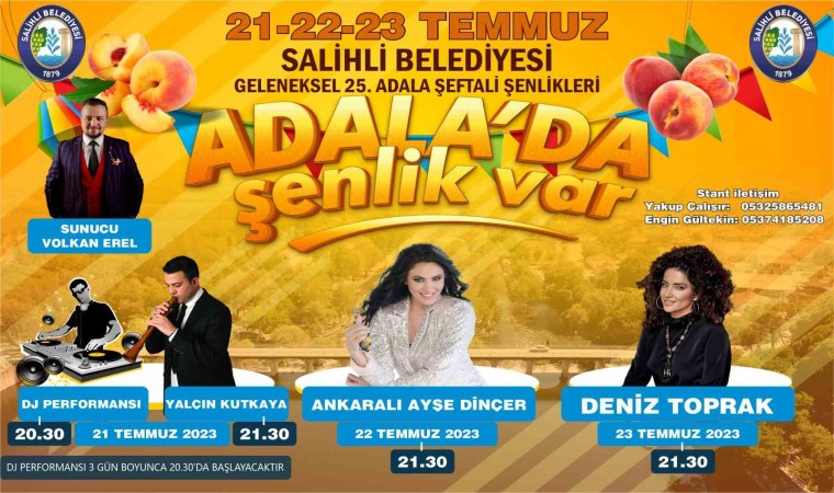 Salihli Belediyesi’nin kültürel ve sosyal etkinlikler çerçevesinde düzenlediği Geleneksel 25. Adala Şeftali Şenliği’nde birbirinden özel sesler sahne alarak en güzel şarkıları ve türkülerini Salihlili hayranları için söyleyecek.
