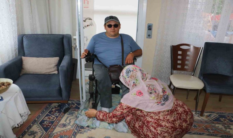 Sivas’ta, doktor hatası sonucu bedensel engelli olan İsmail Furkan Er, salonuna kurulan özel asansör sayesinde 22 yıl sonra yeniden sosyal hayata adım attı.