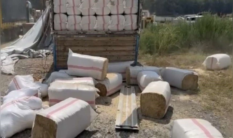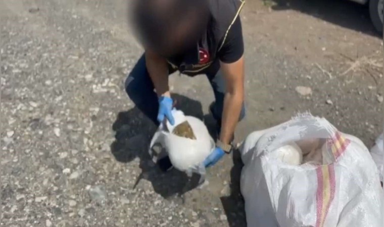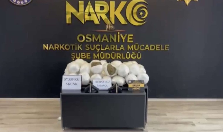Osmaniye İl Emniyet Müdürlüğü, Narkotik Suçlarla Mücadele Şube Müdürlüğü ekipleri yol uygulama noktasında kamyon ve otomobili durdurdu. Hassas burunlu narkotik köpekle birlikte yapılan aramada kamyonda yüklü saman balyalarının arasında, 57 kilo 850 gram skunk maddesi, 2 ruhsatsız tabanca, 22 fişek ele geçirildi. Otomobilde bulunan Azad A., Cihan A., Hasan S. ve Sedat Z., uyuşturucu veya uyarıcı madde imal ve ticareti suçundan yapılan adli işlemlerinin ardından sevk edildikleri mahkemece tutuklanarak cezaevine teslim edildi.