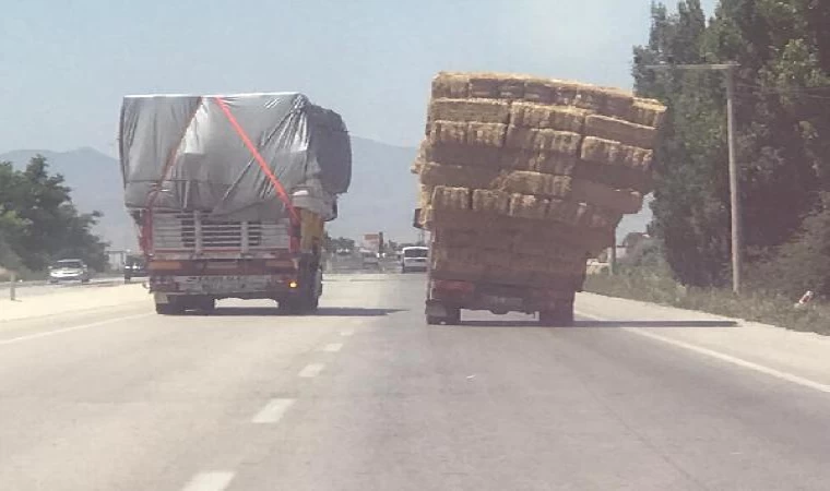 Konya- Adana karayolu Ereğli ilçesi Kargacı mevkisinde, kasasının iki katı saman balyası yüklü kamyon, aynı şeritte seyreden diğer sürücüleri korkuttu. Alabileceğinden çok fazla yük alan kamyon, sağ tarafına eğik bir şekilde trafikte seyretti. O anlar ise başka bir sürücünün cep telefonu kamerasına yansıdı. Kamyon bir süre sonra gözden kayboldu. (DHA)