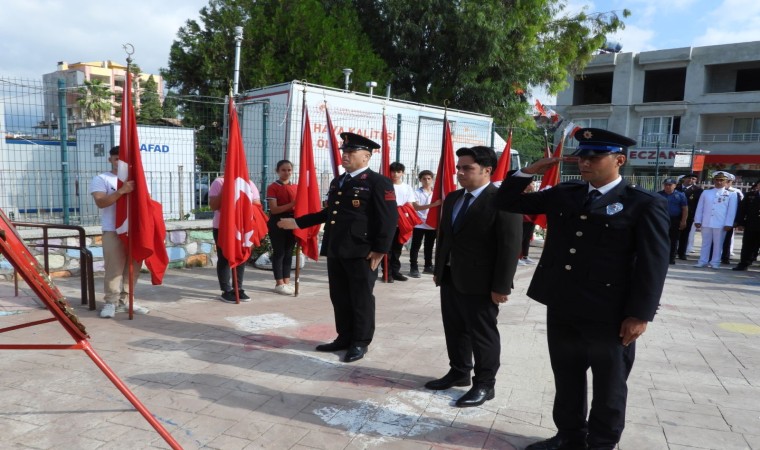 Tören, Atatürk Büstüne çelenk sunmayla başlayıp, saygı duruşunun ardından İstiklal Marşı’nın okunması ile devam etti. Kaymakamlık önünde çelenk sunma töreni yapıldı. Çelenk sunma törenine Kaymakam Emre Dündar, Belediye Başkan vekili Tahsin Demir, Cumhuriyet Başsavcısı Mehmet Onurkan Gülderen, Emniyet Amiri İbrahim Şekerci, Sahil Güvenlik Komutanı Yarbay Mevlüt Mercan, İlçe Jandarma Komutanı Harun Bulut, Milli Eğitim Müdürü Erdem Yaşar, Gaziler, oda başkanları, STK temsilcileri ve çok sayıda vatandaş katıldı.
